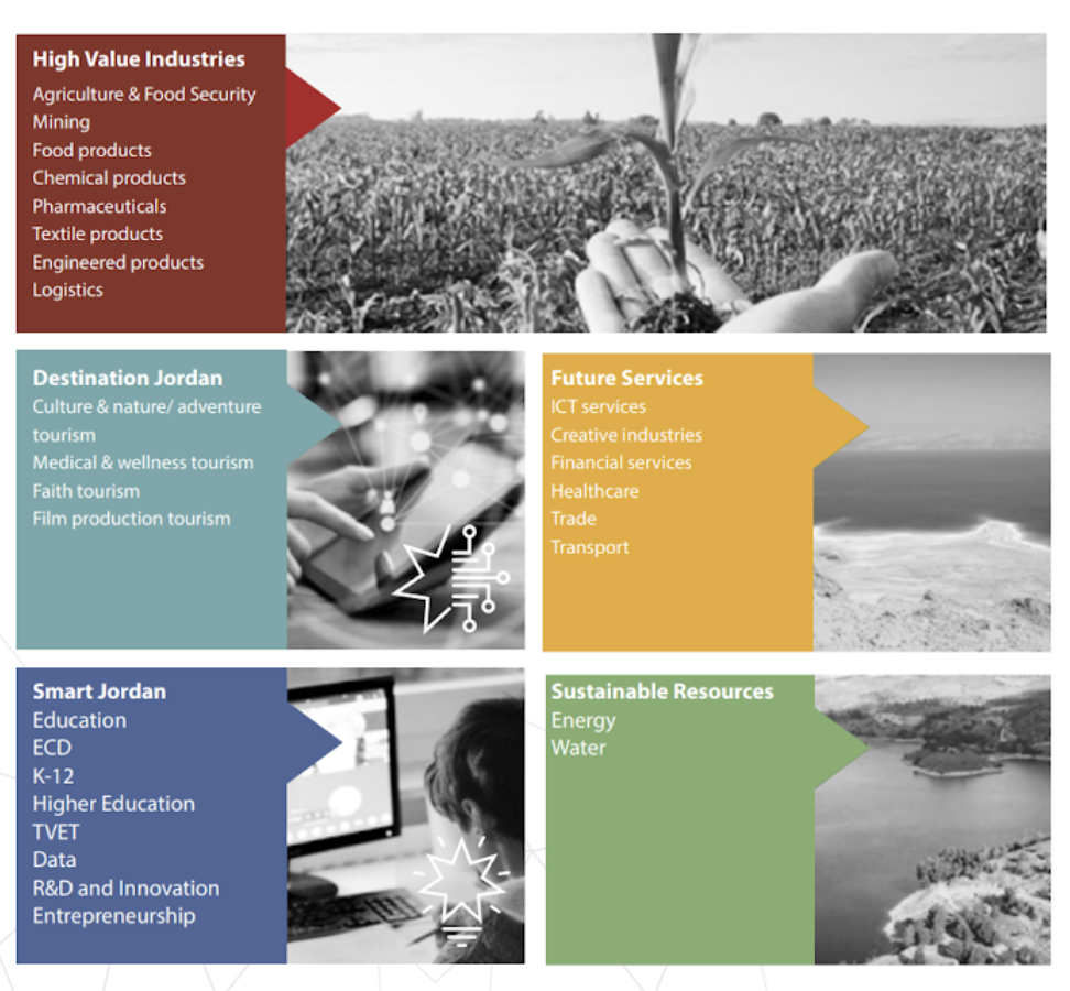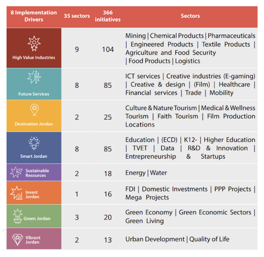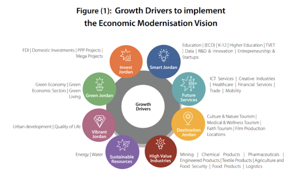His Majesty King Abdullah II, in a letter on January 30, 2022 addressed the Jordanian people on his 60th birthday, and highlighted the aspirations for Jordan’s future, within a comprehensive national vision that spans governments and engages all: click here to read Jordan’s Economic Modernisation Vision. Below is an image which captures the key economic growth drivers, which are seen as strategic focus to ensure the country’s sustainable development and competitiveness, and create a better quality of life for its citizens.