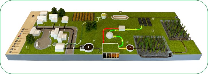 The acronym APOC stands for “Anaerobic digestion”, “Photocatalytic Oxidation” and “Constructed wetland(s)”, the three components of an eco-innovative system for the treatment of domestic wastewater, as shown by the 3-dimensional miniature replica below.