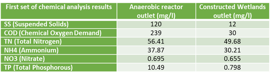 “Our first analytical results show a very low concentration of Chemical Oxygen Demand (COD) and of Suspended Solids (SS) at the outlet of the Constructed Wetlands. Although the nitrogen compounds removal does not appear to be very good, I suppose we need more time for the growth of the plants and nitrifying bacteria in these newly constructed wetlands. On the other hand, I think that in the next analysis we shall see a higher concentration than the one obtained for this first test, since at least to me, the removal efficiency shown in the table below seems to be ‘too’ good."