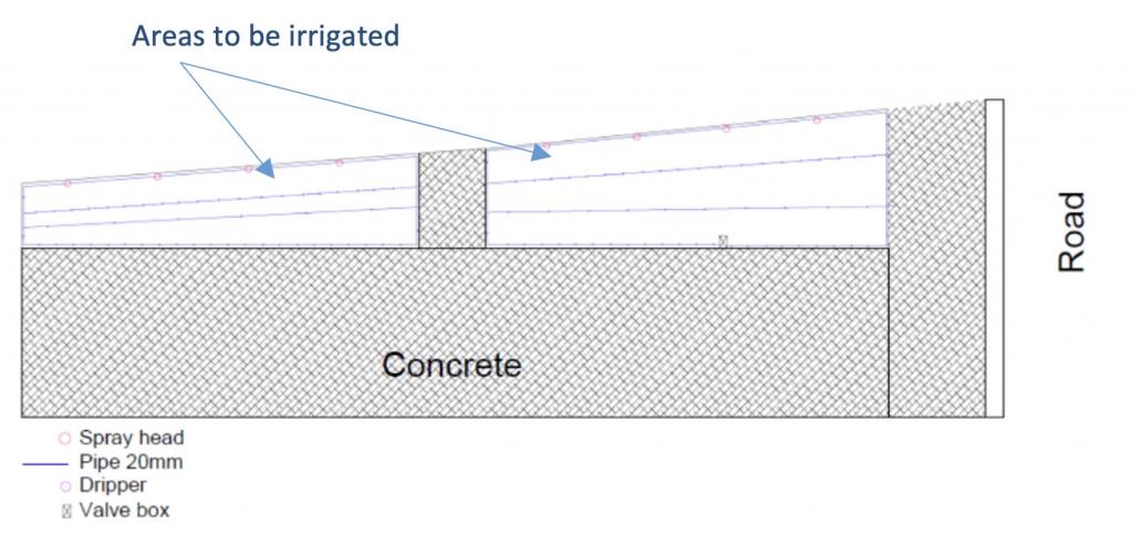 The concerned surface area to be irrigated is around 500 m2 irrigation. It is located at the Southern entrance of the circular building of IRI. Figure 2 below shows a preliminary layout of the area with a suggestion of irrigation fixtures. (Bidders can offer another suitable suggestion).