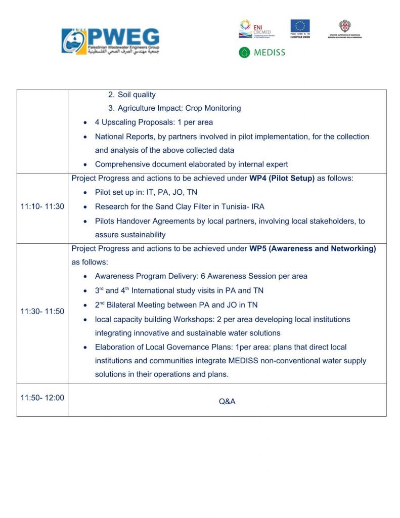 Generally speaking, to the satisfaction of all participants, MEDISS successfully overcame the COVID19 crisis, managing, albeit with adjustments to the time schedules slowed down by the restrictive measures, to reach the final phase with pilot plants completed or nearing completion and with the monitoring plans on water soils and agricultural production underway.