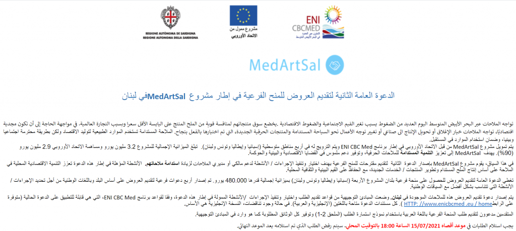 The project MedArtSal is issuing the second call for proposals for sub-grants in Lebanon with the aim of selecting and implementing actions / activities to support local salinas owners or managers to increase the sustainability of their business. Eligible activities under this call includie the promotionof local economic development based on sustainable salt production and the development of new products/services, while preserving local environmental and cultural values.