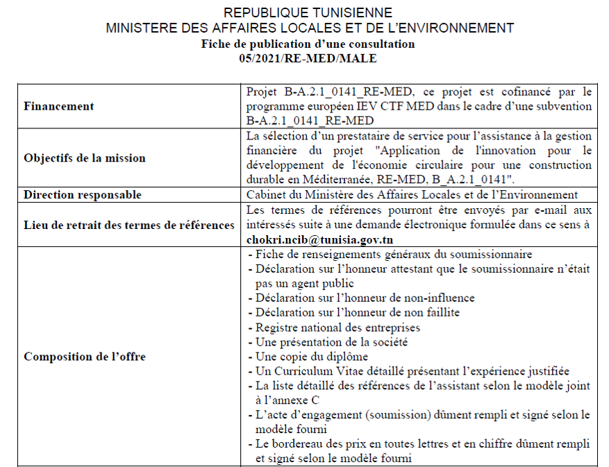 Le Ministère des Affaires Locales et de l'Environnement, partenaire tunisien du projet RE-MED, lance un avis de consultation nationale pour la sélection d’un prestataire de service pour l’assistance à la gestion financière du projet, financé par le Programme IEV CTF Med.