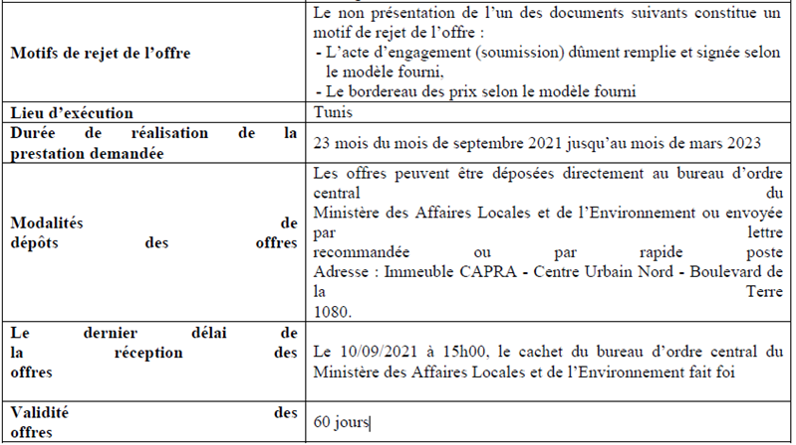 Dernier délais de réponse le 10 septembre 2021 à 15h, heure locale Tunisie (le cachet du bureau d’ordre central du Ministère des Affaires Locales et de l’Environnement fait foi).