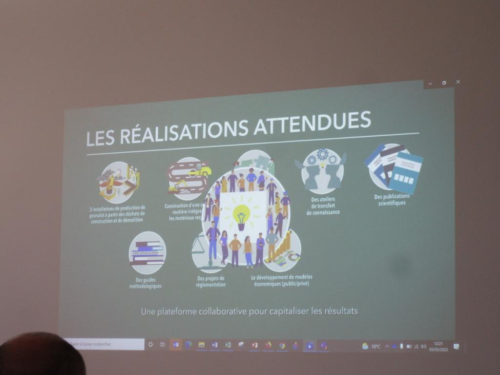 Les participants ont constitué trois groupes de travail et Oumaya Marzouk a été invitée à animer celui visant à imaginer les solutions de demain qui amélioreront le réemploi des déchets de chantier. L’objectif est de limiter le gaspillage des ressources et l’impact environnementale en augmentant l’efficacité à tous les stades de l’économie des produits. L’un des principaux enjeux évoqués était de s’adapter à la nouvelle réglementation RE2020 et de limiter les dépôts sauvages. Dans ce cadre, Oumaya MARZOUK a parlé de la plateforme RE-MED community qui proposera des actualités sur le thème de l’économie circulaire, des offres d’emploi, des offres de compétences, et mettra en relation des acheteurs et des vendeurs de matériaux à re-employer ou recycler issus du BTP ainsi que de l’application de lutte contre les décharges sauvages développés dans le cadre du projet RE-MED.