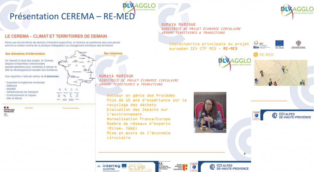 Après une introduction de l’atelier par Vincent ALLEVARD, Vice-Président délégué à l’environnement de la DLVAgglo, Laure NERVI de la CCI PACA a présenté le projet CIRCUITO et Oumaya MARZOUK a présenté le Cerema et le projet européen RE-MED co-financé par le programme IEV CTF MED.