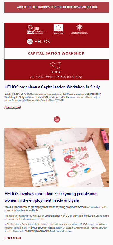 Read the 7th newsletter to find out the latest news, events, HELIOS tales and training initiatives about Blue and Circular Economy, entrepreneurship and soft skills for unemployed young people and women from Italy, Spain, Greece, Tunisia, Palestine and Jordan.