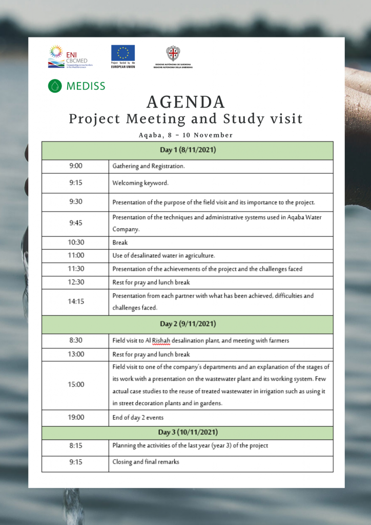 Since the pandemic complicated normal activities, it is finally possible for the MEDISS partners to start with face-to-face meetings. From 8 to 10 November 2021 took place an international study visit in Jordan which gathers together all the representants of the Aqaba Water Company (Jordan), the Palestinian Wastewater Engineers Group (Palestine), the Governorate of Jericho & Al-Aghwar (GoJ), the Médenine Arid Regions institute (Tunisia), the Sardinian water authority (Italy), the Centre For North-South Economic Research (Italy), Arborea Producers' Cooperative (Italy).