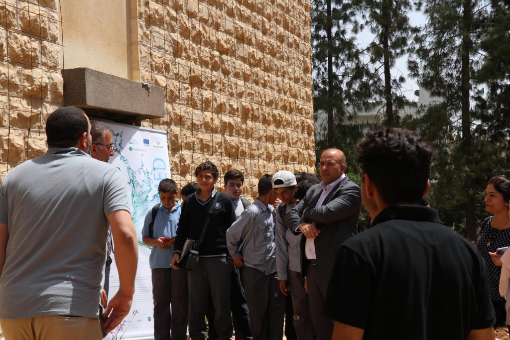 In addition, the campaign included a field visit to the pilot plant for grey water treatment in Al-Zahra’a dormitory at the University of Jordan, in the presence of representatives of the construction company, where the participants listened to a brief and simple explanation about the techniques of nature-based solutions (green walls) and their role in treating water.