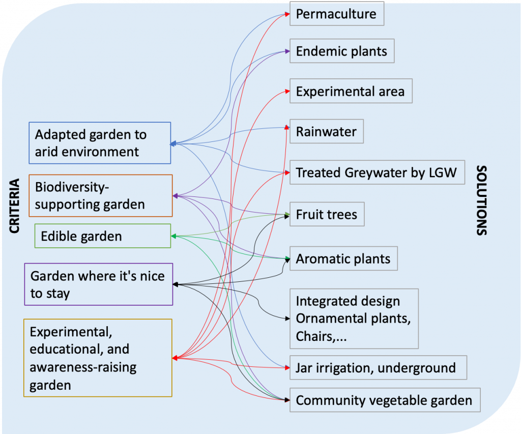 The third part was moderated by landscape architect Ms Nawel from ALEA OLEA Architecture & Paysage, with the initial goal of co-designing the nourishing garden with the participants. A list of criteria was developed, and suitable solutions to implement were proposed and discussed (see figure) by students.