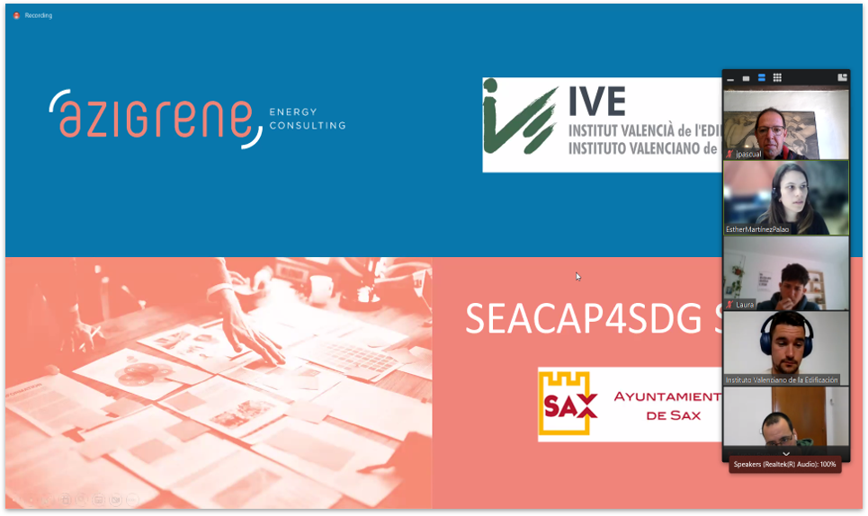 During the last weeks the Spanish main partners of the SEACAP4SDG project, IREC and Instituto Valenciano de la Edificación (IVE), delivered the first session of the local training in collaboration with the Municipality of Lloret de Mar and the Municipality of Sax, selected as beneficiary of the support mechanism set up by the project in Spain. The training was held online during the period 01 - 22 March 2023, and it saw the participation of specialists from the selected external entities Azigrene and ERF, which will assist the municipalities in the implementation of the actions planned, staff from both municipalities and representatives of the Girona Provincial Council.