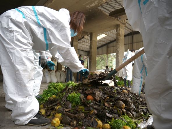 The sessions started with a recapitulation about how to recognize biowaste, the composting process and the scientific approach to composting by Tommy Waked, biowaste consultant and trainer. After that, the trainees were asked to suit up with a disposable overall, waterproof wellies in addition to gloves and face masks, as their long, hard working day was just about to start.