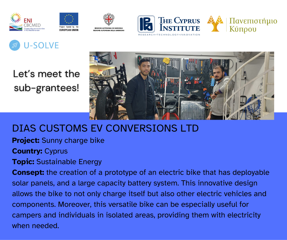 3. DIAS CUSTOMS EV CONVERSIONS LTD with the Project: Sunny Charge Bike. DIAS CUSTOMS is aiming to introduce an innovative prototype through the U-SOLVE project: an electric bike equipped with deployable solar panels and a powerful battery system. This groundbreaking design not only allows the bike to charge itself but also other electric vehicles and components. The versatile Sunny Charge Bike holds particular promise for campers and individuals in isolated areas, providing them with electricity when needed.