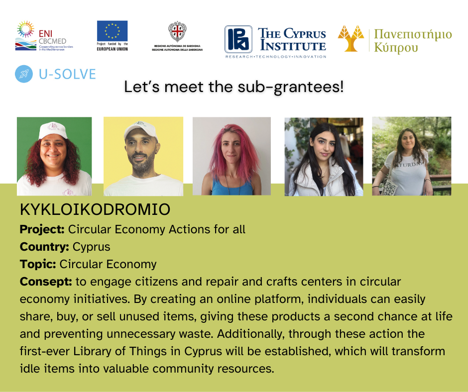 2. KyklOIKOdromio with the Project: Circular Economy Actions for All. Dedicated to promoting circular economy initiatives, KyklOIKOdromio aims to engage citizens and repair and crafts centers. Their online platform, currently in development, will enable individuals to easily share, buy, or sell unused items, giving these products a second chance at life and preventing unnecessary waste. Additionally, KyklOIKOdromio is excited to establish Cyprus's first-ever Library of Things, where idle items can be transformed into valuable community resources.