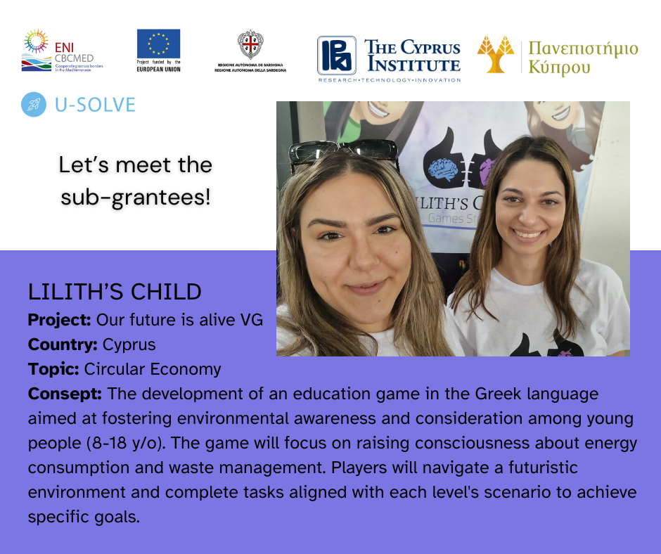 5. Lilith’s Child with the Project: Our Future is Alive video game. Lilith’s Child is dedicated to developing an educational video game in the Greek language that fosters environmental awareness among young people aged 8-18. The game focuses on energy consumption and waste management, challenging players to navigate a futuristic environment and complete tasks aligned with each level's scenario to achieve specific goals.
