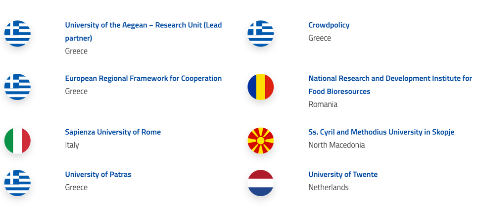 PROMETHEUS involves 8 partners: University of the Aegean (leader), University of Twente, Sapienza University of Rome, University of Patras, Ss. Cyril and Methodius University in Skopje, Crowdpolicy, European Regional Framework for Co-operation and National Research & Development Institute for Food Bioresources.